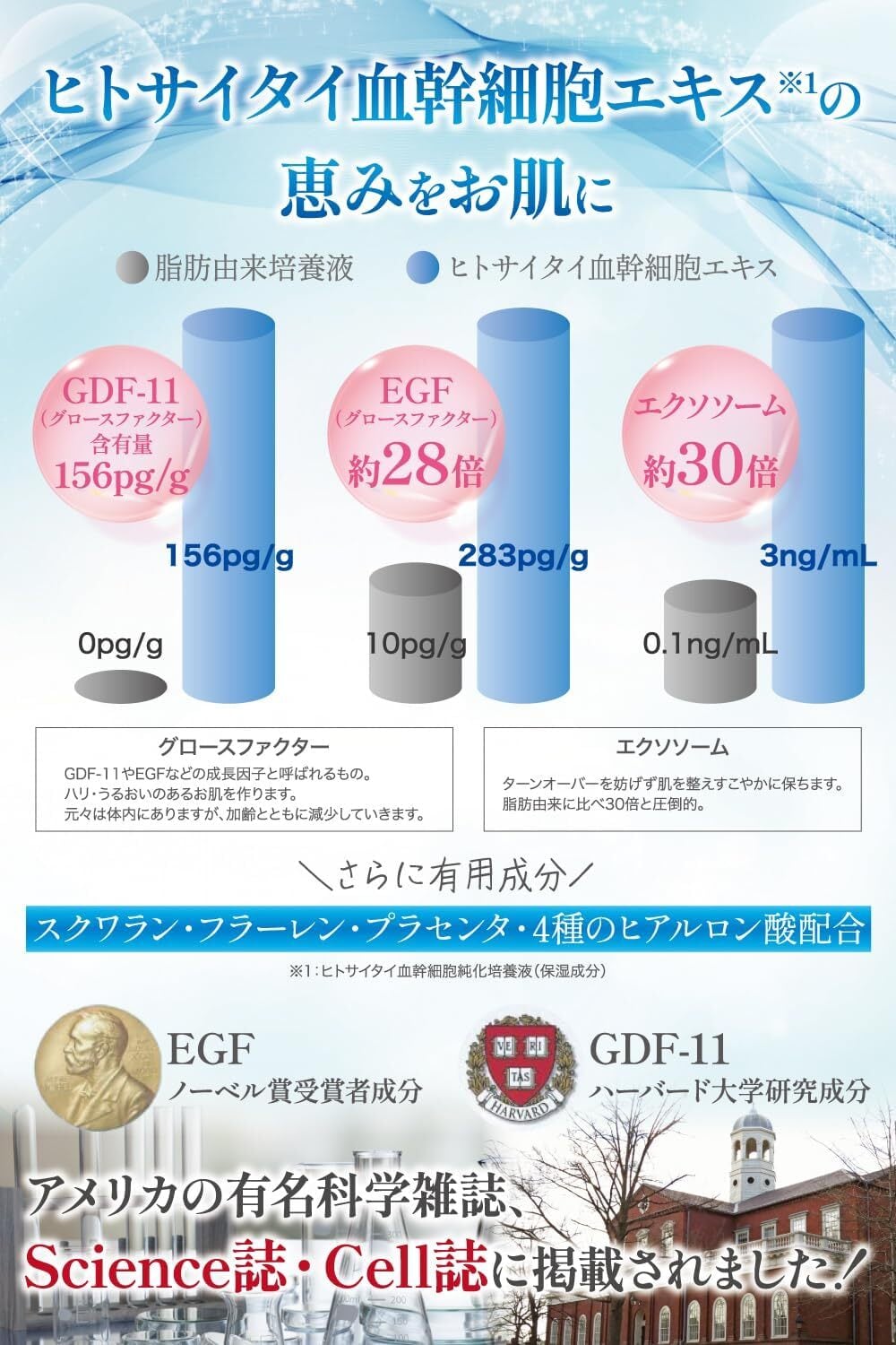 - 高品質な成分を使用し、日本で製造しています。厳しい基準をクリアしたヒト幹細胞成分*1を使用し、安全性と効果を両立しています。