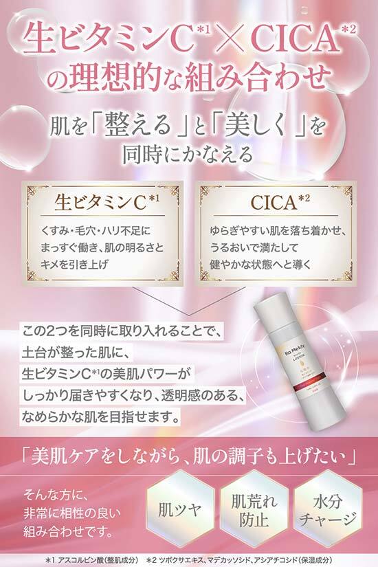 生ビタミンC※¹とCICA※²のWアプローチで、潤いを与えながら肌コンディションを整える日本製化粧水です。高保湿の3種ヒト型セラミド※³、人気成分のプラセンタ※⁴、プロテオグリカン※⁵を配合し、乾燥によるカサつきやハリ不足、キメの乱れをおだやかにケアします。しっとりとしたうるおいが肌全体に広がり、透明感のある健やかな肌へ導きます。
